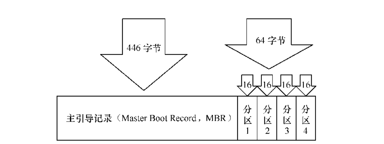 硬盘设备是由大量的扇区组成的,每个扇区的容量为 512 字节。其中第一个扇区最重要,它里面保存着主引导记录与分区表信息。就第一个扇区来讲,主引导记录需要占用 446 字节,分区表为 64 字节,结束符占用 2 字节;其中分区表中每记录一个分区信息就需要 16 字节,这样一来最多只有 4 个分区信息可以写到第一个扇区中,这 4 个分区就是 4 个主分区。第一个扇区中的数据信息: